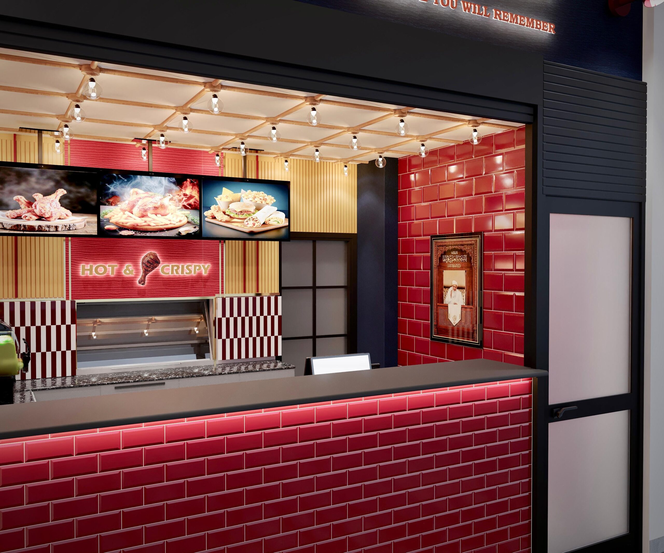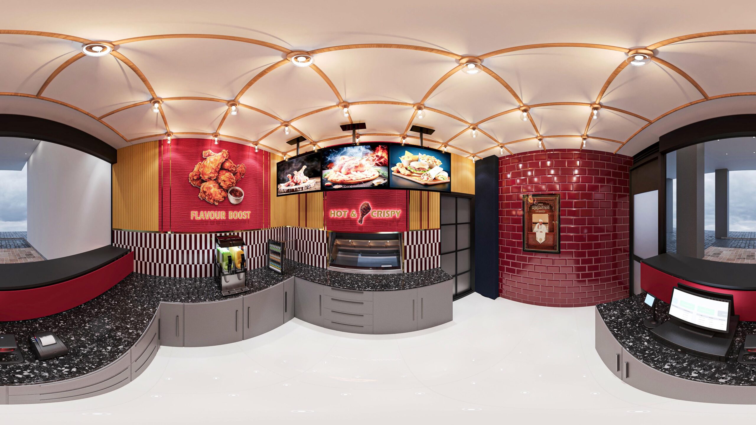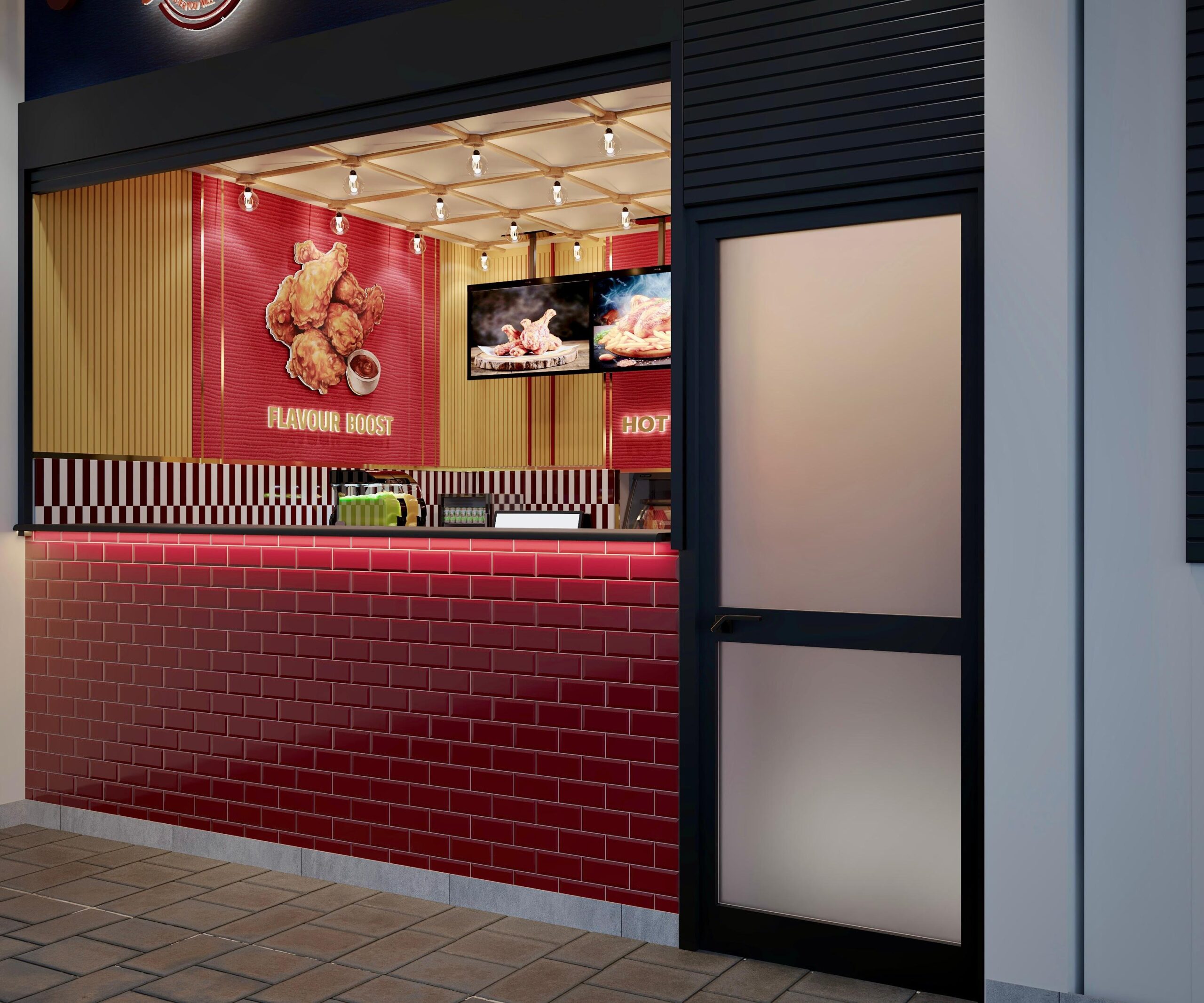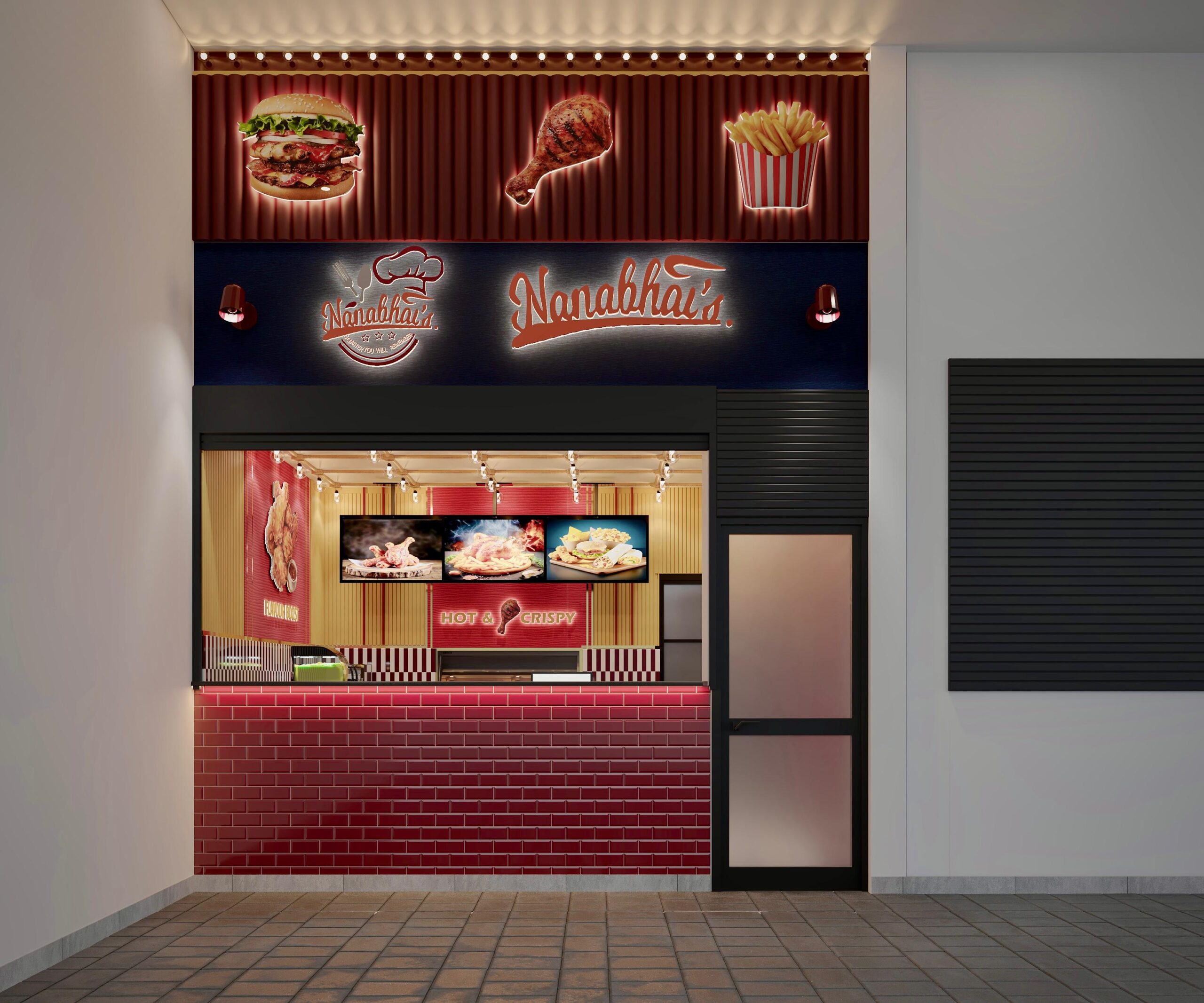 Nanabhai’s Fast Food is a bold, street-style eatery that brings the energy of Nairobi’s food culture to life. The design combines deep reds, glowing signage, and crisp lighting to create a space that screams flavor and confidence. From the brick-patterned counter to the sizzling food visuals above, every detail tells one story — hot, crispy, and unapologetically satisfying.