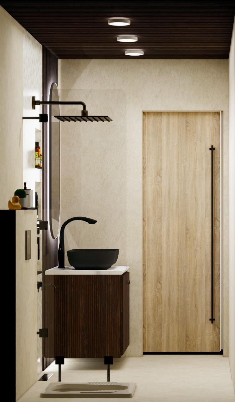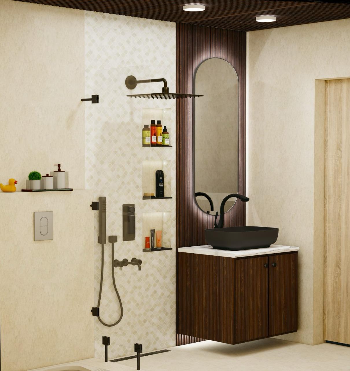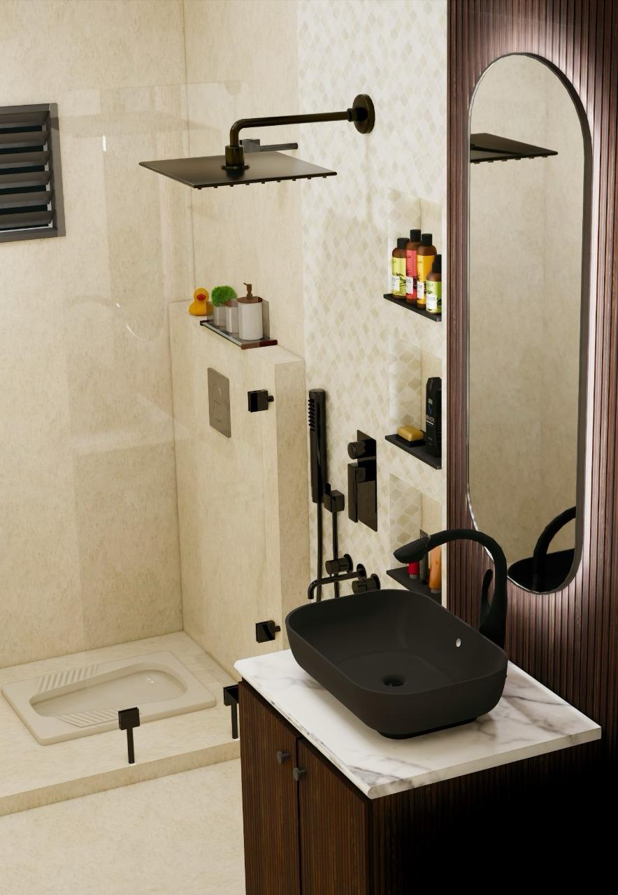 A luxurious residential washroom in Kharegone, designed with premium finishes, elegant fixtures, and a spa-like ambiance for ultimate comfort and style.
